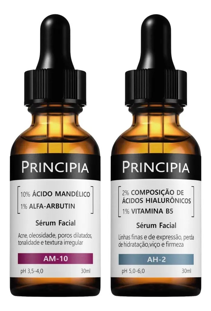 2 Séruns Principia Mandélico + Hialurônicos para uma rotina de cuidados com a pele altamente eficaz contra manchas, acnes, cravos e desidratação. INDICAÇÕES Principais » Diminuir cravos e espinhas » Promover hidratação » Aumentar a firmeza e elasticidade » Clarear manchas escuras » Controlar a oleosidade » Reduzir tamanho dos poros » Melhorar o viço Complementares » Reduzir e uniformizar a pigmentação » Suavizar rugas e linhas finas » Diminuir olheiras e bolsas » Proporcionar maciez Tipos de pele